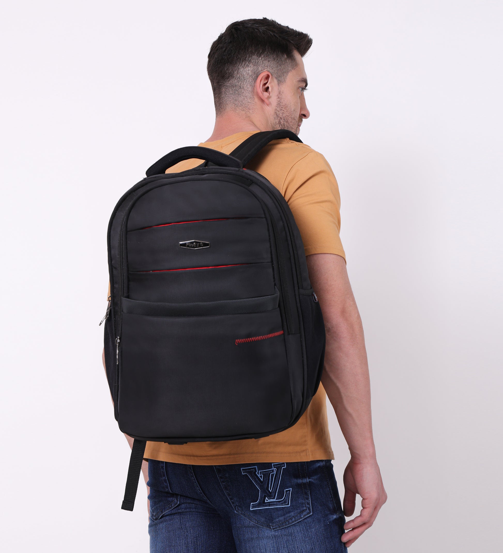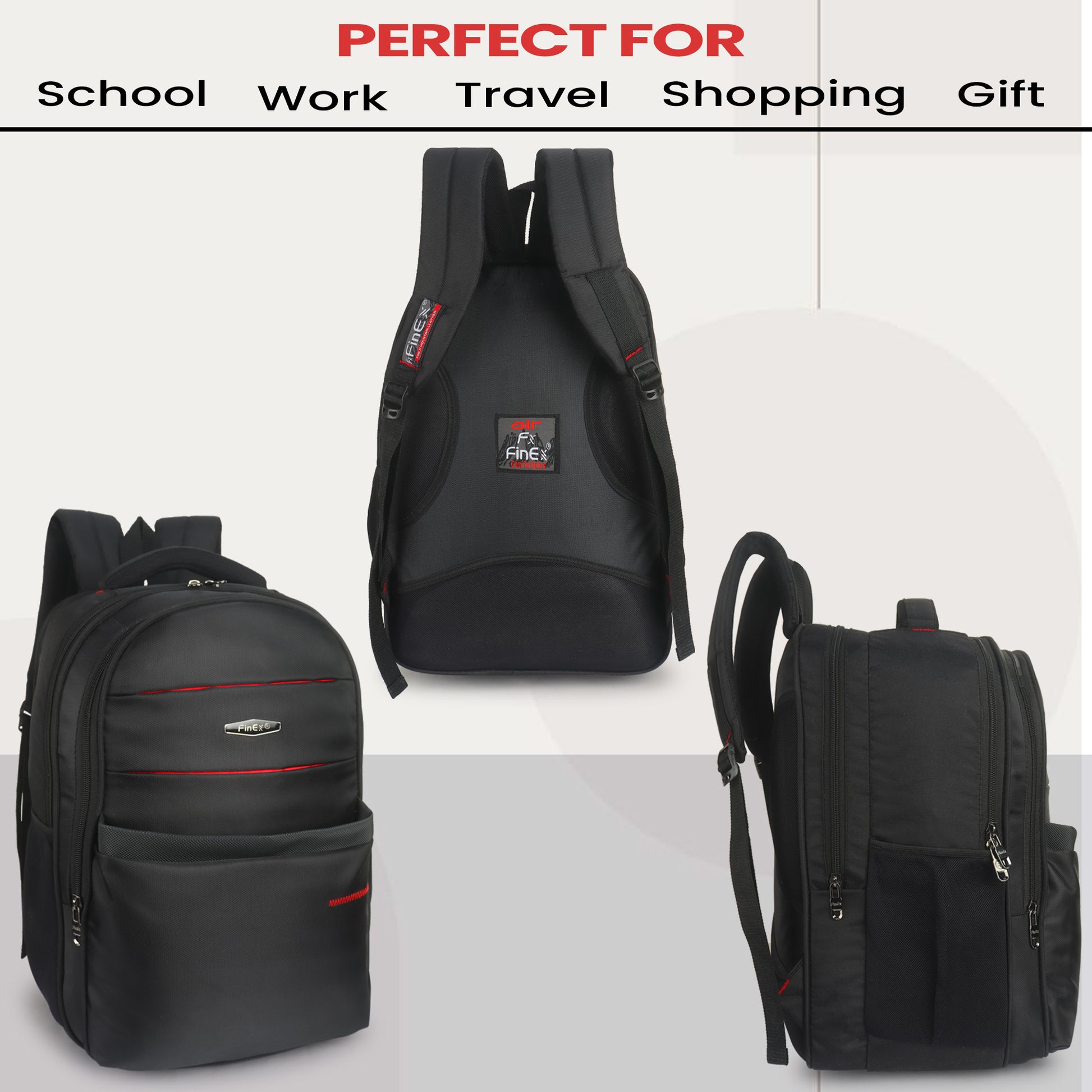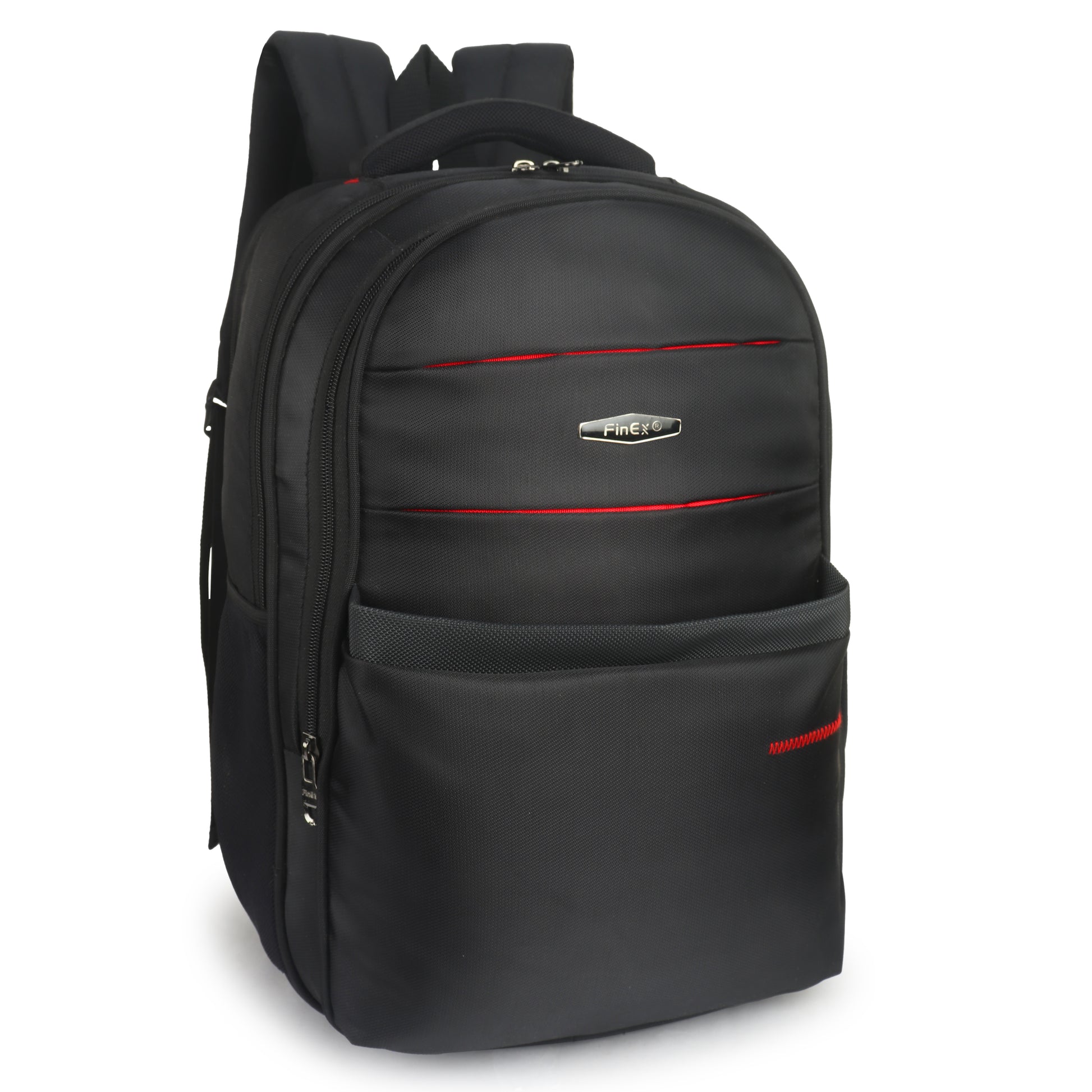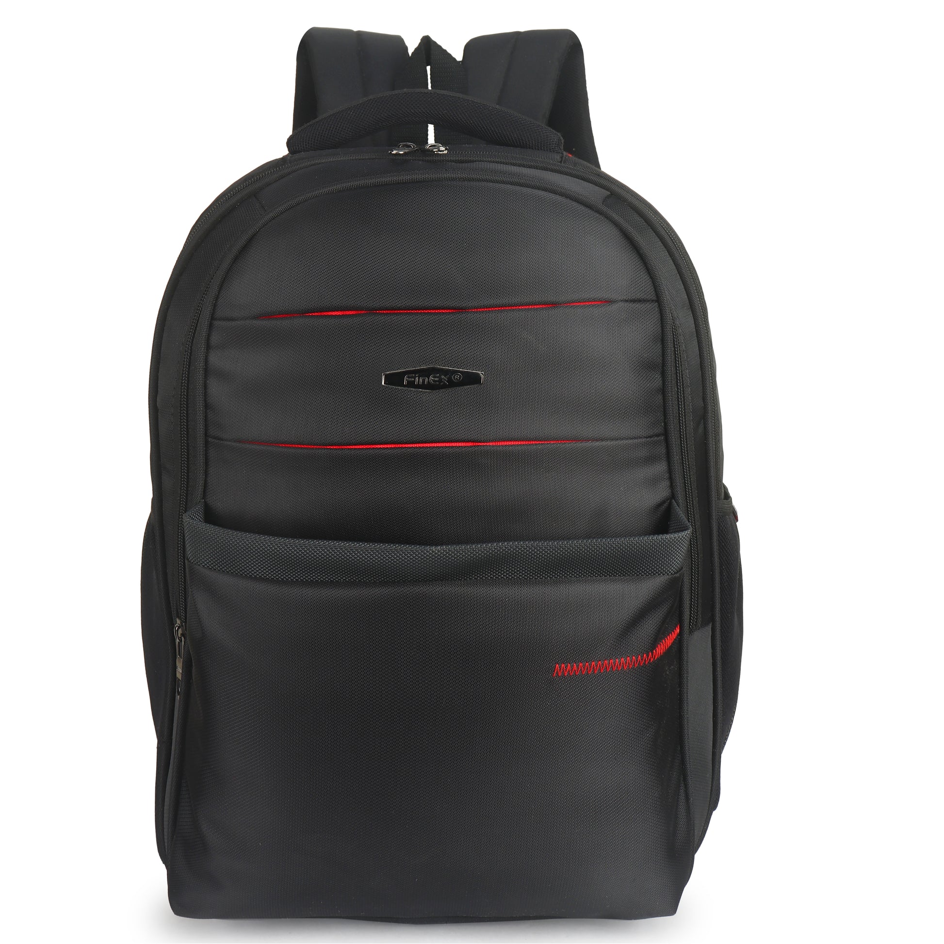 Introducing the Fine x backpack, a sleek and practical companion for your daily adventures. This sophisticated black backpack features multiple compartments with secure zipper closures, making it perfect for organised storage. The thoughtfully designed front panel showcases stylish red accents and curved stitching patterns that add a modern aesthetic touch. Crafted from durable material, it offers ample space for your essentials while maintaining a professional appearance. The ergonomic padded shoulder straps ensure comfortable carrying, while the mesh side pockets provide easy access to frequently needed items. Whether you're heading to work, university, or embarking on a short trip, this versatile backpack combines functionality with contemporary style. Its robust construction and practical design make it an ideal choice for everyday use.